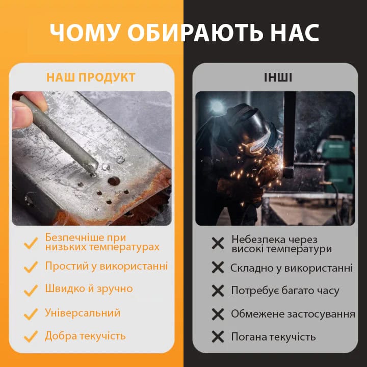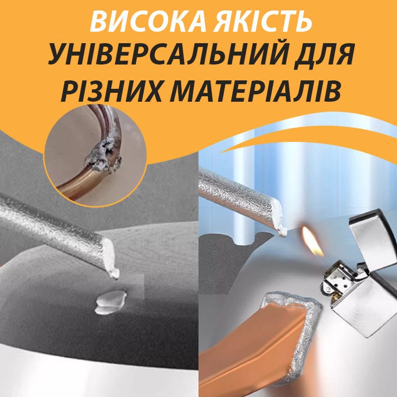 Ідеально підходить для наступних матеріалів: чавун; сталь; залізо; алюміній і дюраль; мідь; бронза; латунь; шифер; нержавійка; оцинкування; термостійкий пластмаса; кераміка; та інші. Структура універсального зварювального олівця забезпечує адгезію (прилипання) навіть на іржавої поверхні, як на горизонтальній, так і на вертикальній площині.